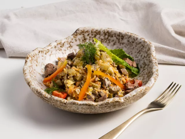 Этот салат считается низкокалорийным, несмотря на это он насыщает на длительное время. Отварная куриная печень придает салату нежный вкус, особенно в сочетании с тушеными морковью и луком, а сладкий и яркий болгарский перец — изюминку. Витамин B в составе куриной печени поддерживает иммунитет и благотворно влияет на кровеносную систему.