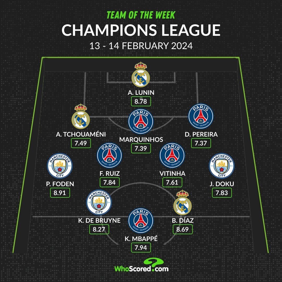 Футболисты «ПСЖ», «Реала» и «Манчестер Сити» попали в символическую сборную Лиги чемпионов по итогам недели. «ПСЖ» обыграл «Реал Сосьедад» (2:0) в первом матче 1/8 финала турнира благодаря голам Мбаппе и Барколя. Килиан, а также его одноклубники Маркиньос, Витинья, Фабиан Руис и Данилу Перейра попали в символическую сборную недели. Место в воротах занял голкипер «Мадрида» Андрей Лунин, сделавший множество сэйвов в матче с «Лейпцигом», а Орельен Тчуамени составил компанию Маркньосу и Перейре в обороне. Еще один представитель «Мадрида» и автор победного гола в ворота «Лейпцига» Браим Диас заслужил место в атакующей тройки с Мбаппе и Де Брюйне. Кевин блестяще провел матч с «Копенгагеном» и помог «Сити» выиграть (3:1). Его одноклубники Фил Фоден и Жереми Доку вместе с Руисом и Маркиньосом дополнили полузащиту команды недели.