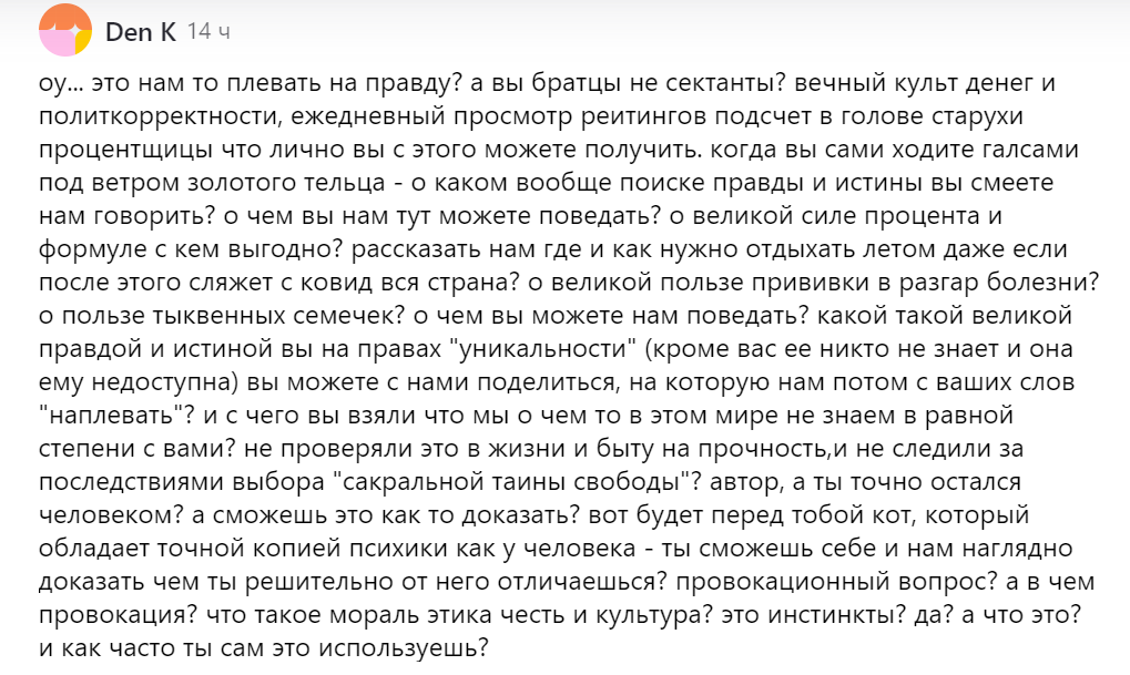 Ну и серьёзно, если у человека есть время и мотивация писать длинню-у-учие обвинительные комментарии на моём канале - ну вряд ли он счастлив.