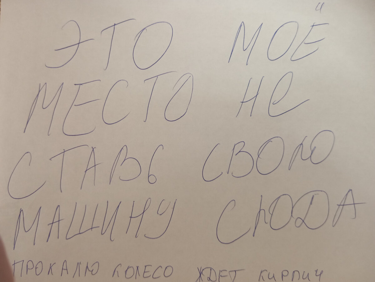 Что делать если сосед выгоняет с парковочного места, считает что это место его, так как он давно живёт в доме, кладёт записки под стекло