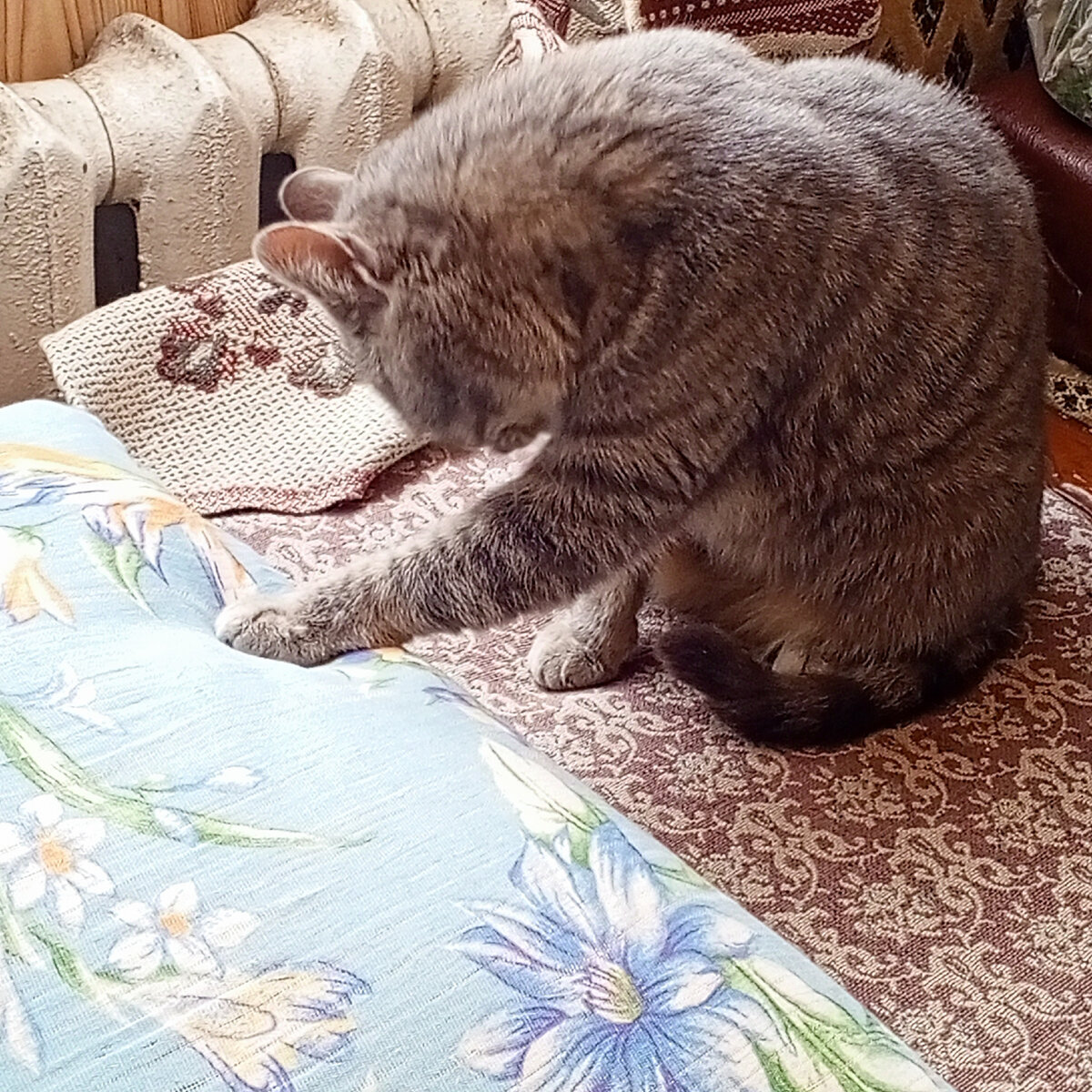 Догадайтесь, мои дорогие читатели, о ком пойдет речь?) Конечно, о кошках! Ну кто из нас не знает , что кошка - самое чистое существо на свете? Наблюдения ученых показали, что около 30 процентов времени наши мурчалки посвящают уходу за собой. А мамочки - кошки кропотливо чистят шёрстку котят до 150 раз на дню. Такое отношение к чистоте обусловлено генетически и уходит вглубь веков. Кошка - облигатный ( то есть строгий) хищник, и чистота для нее - главное условие удачной охоты. Кроме того, усики кошки не должны быть склеенными от остатков пищи, потому что при их помощи семейство кошачьих осязает мир. Ну ладно, теорию в сторону. Знакомые ракурсы для ваших домашних любимцев? Позирует Муся, Мусильда Людмиловна - мать, вернее, тетушка всего нашего кошачьего семейства. Хотя и правда, именно она мать - кошка, ведь именно эта стерилизованная кошь подняла и выпестовала всех своих племянниц, как дочек родных. Поза - ХОБА!))) Я всегда в восторге от этого зрелища...Нам, людям, сия позици