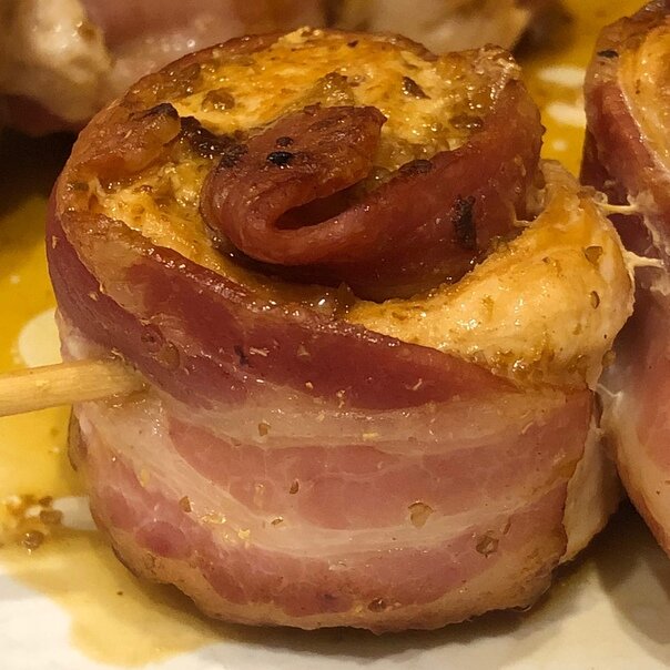 Достаточно простое, сытное и главное быстрое блюдо. Подача просто шикарная, на столе выглядит очень аппетитно и может накормить гостей. Можно приготовить как на сковороде так и на мангале. Что нам понадобится: Приступим. Куриные грудки режем в доль пополам. Далее кухонным молотком через полиэтиленовый пакет отбиваем наши половинки до толщины 5мм, будьте аккуратны не переусердствуйте, что бы наша курочка не прорвалась. Далее нарезаем получившуюся отбивную на полоски, шириной равной ширине нашего бекона. Затем на каждую полоску куриного филе мы кладем полоску бекона. Солим и перчим по верх и сворачиваем в рулет. Далее насаживаем вдоль наш рулетик на деревянную шпажку что бы наши рулетики не развалились. На одну шпажку влезает как раз по три рулетика, как раз выглядит как миниатюрный шампур с шашлыком. На фото ниже вы можете посмотреть как у вас должно получится. Далее разогреваем сковороду, можете не использовать масло так как бекон вытопит жир. и обжариваем наши шпажки по 5 минут на ка