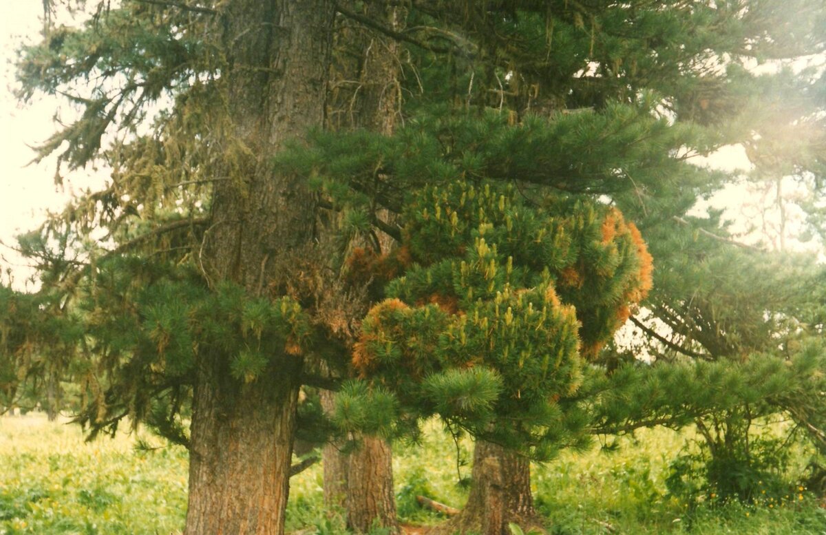 Выглядит необычно. Уже в год прививки, если она нормально прижилась и находится в благоприятных условиях, побег почти не растет, зато кроме центральной почки закладываются еще 2-3-4 десятка боковых. На втором году жизни все они дают побеги, которые в длину опять же почти не растут, но продолжают ветвиться. Это выглядит и оригинально, и красиво. Но прививка представляет собой настолько плотный пучок побегов, что между ними трудно просунуть даже тонкий нож, чтобы например, как-то проредить их. А ведь на каждом побеге есть еще и хвоя, которая также растет, следовательно, уплотняет этот самый пучок. В результате получается сплошная безвоздушная масса переуплотненных мягких живых тканей. Побеги продолжают расти. Их взаимное давление усиливается.