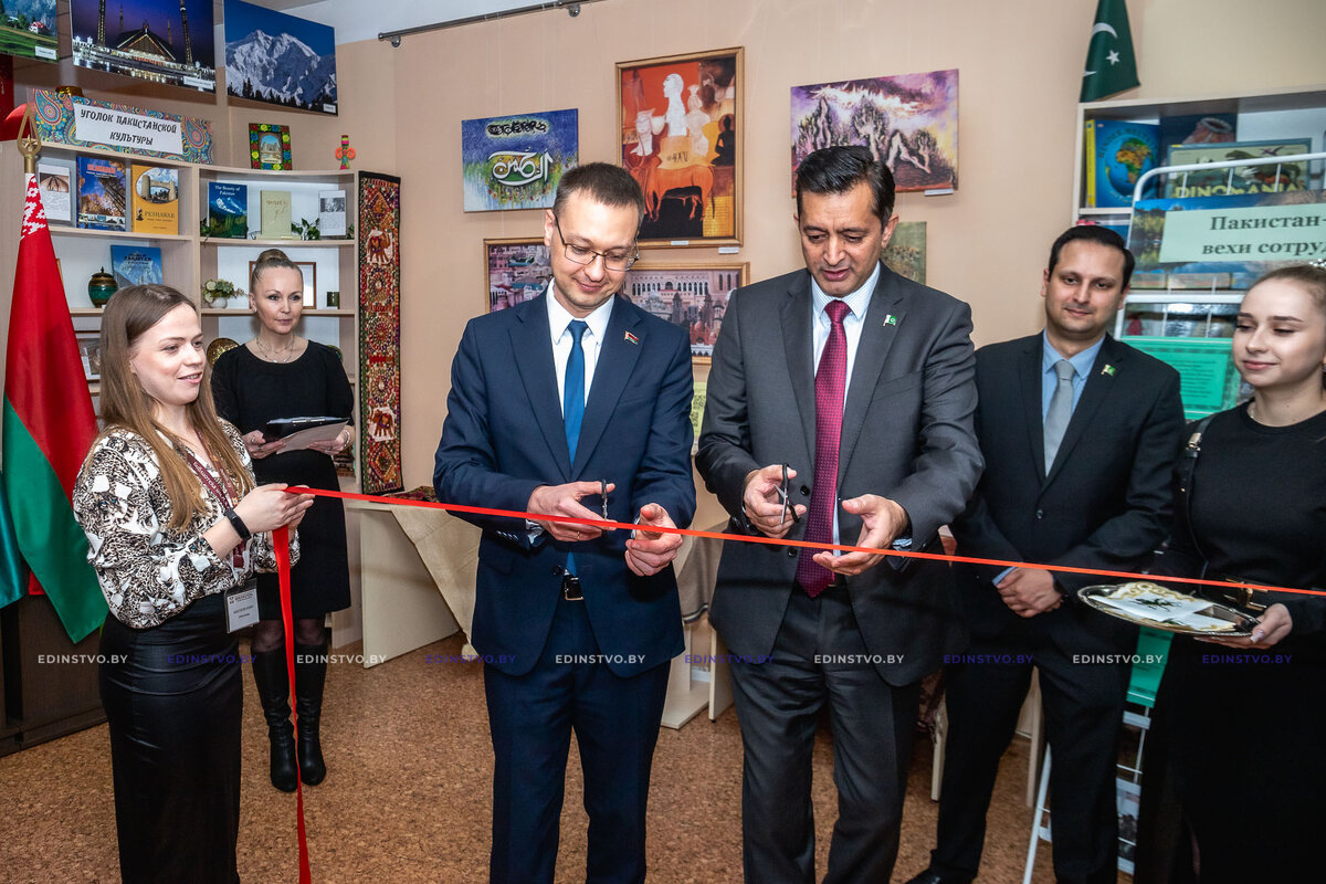 Чрезвычайный и Полномочный Посол Исламской Республики Пакистан в Республике Беларусь Саджад Хайдер Хан, его заместитель Момин Азиз Куреши и первый заместитель председателя Борисовского райисполкома Николай Швайбович в присутствии других должностных лиц, корреспондентов СМИ, сотрудников и читателей библиотеки торжественно открыли сегодня в Борисовской центральной районной библиотеке им. И.Х. Колодеева «Уголок культуры Пакистана».