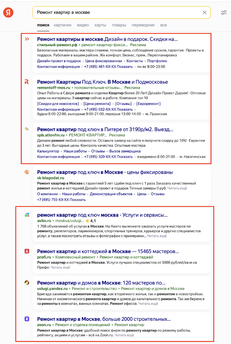 Пример выдачи по запросу “Ремонт квартир в Москве”.