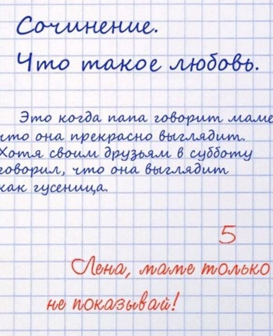Приближение весны настраивает на лирический лад, а выписки из школьных сочинений и просто записки поднимают настроение. Детская непосредственность просто заставляет улыбнуться-удивиться, а учитель даже дает школьнице рекомендацию как поступить в дальнейшем. В благородных целях естественно, в целях сохранения семьи, любви.