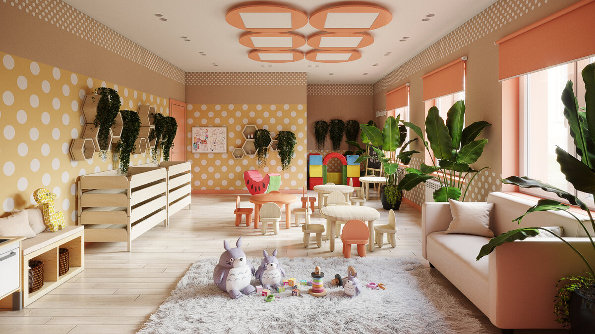 Есть детские сады, оформленные аляповато и пёстро. Плохо подобранные цвета создают беспорядочный информационный шум, в таких местах быстро устают глаза и болит голова. Мы добиваемся противоположного эффекта. Каждый день наши дети получают много визуальной информации. Мы хотим, чтобы, отрываясь от занятий и творчества, ребёнок отдыхал взглядом. Но как выбрать те самые необходимые цвета? Несколько месяцев мы консультировались с педиатрами, детскими психологами, специалистами по колористике, дизайнерами, экспертами по символике цвета... В результате перебора тысяч сочетаний мы пришли к общему мнению: основных цветов будет всего четыре, чтобы не перегружать глаза и нервную систему детей. Что у нас получилось в итоге? Ещё не открыв дверь, вы уже видите фирменный бежевый цвет в логотипе BNP. В беж выкрашена и большая часть стен — это наш основной цвет. По последним научным данным, бежевый умиротворяюще действует на 90% людей, вызывает устойчивые ассоциации с домашним уютом и теплом. Это особ