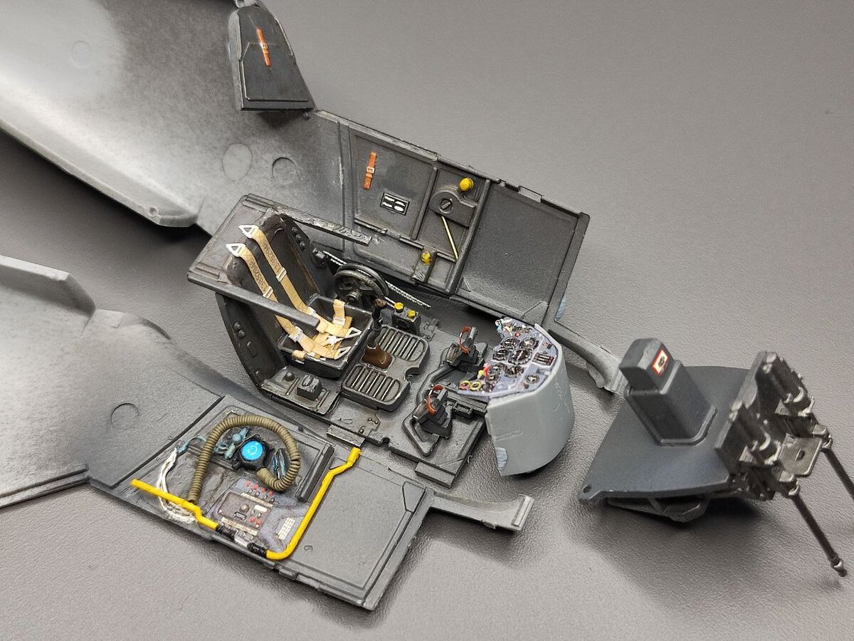Потом, окрасил металликом , для "чипинга" брызнул лаком для волос , и покрыл все RLM66. И тут выяснилось что сидушка со спинкой которая идет по инструкции, была на Эмилях, на F и G сериях ставилась только чаша. Пришлось переделывать. Далее смывка, и Quinta .