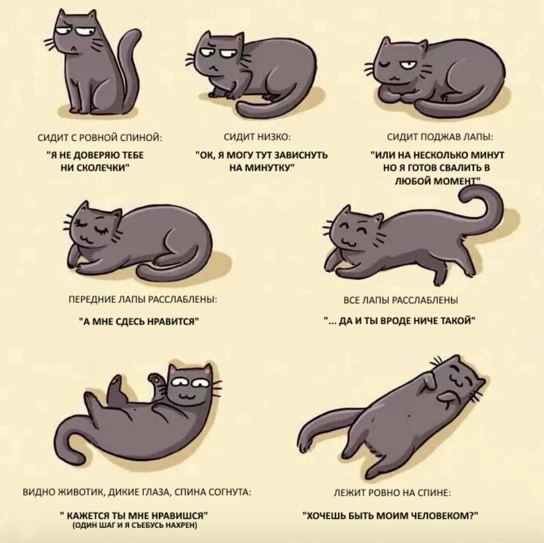 Позы во время сна кошек могут означать следующее: 1.Свернувшись калачиком и прикрывшись хвостом: кошка минимизирует потерю тепла и обеспечивает себе комфортный сон. 2.На спине, пузом вверх: кошка открывает доступ к своему животу, где находятся жизненно важные органы, только если она чувствует полную уверенность, что ей ничего не угрожает. 3.Буррито: кошка прячется под одеяло или подушку, это говорит о желании побыть в одиночестве или спрятаться от чего-либо. 4.Поза «буханка»: кошка поджимает лапки под себя, её тело может напоминать форму буханки. В такой позе кошка сохраняет определенную бдительность и готовность к действию даже во сне. 5.Полуоткрытые глаза: кошка не погружается в глубокий сон, а дремлет и готова быстро отреагировать на изменения в окружающей обстановке. 6.На боку: это наиболее удобная и комфортная поза для сна у кошки. 7.Лапка на лице: животное чувствует себя комфортно и безопасно.