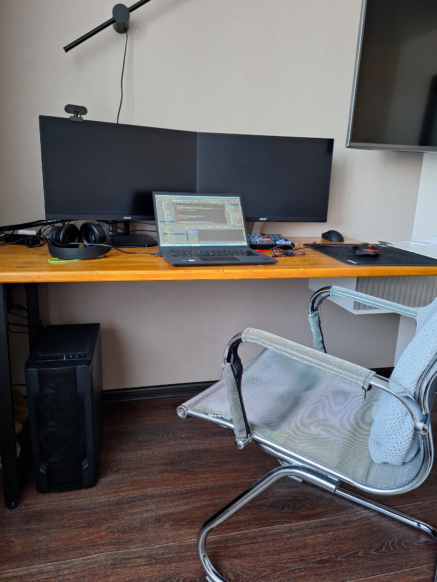 Подвесная столешница подразумевает, что под ней ничего нет. Ведь провода не только портят внешний вид, но и ужасно мешают при мытье полов. Большинство из них мы собрали сразу, но один проводок от роутера все же мешался. И вот недавно мы перенесли точку вайфая в коридор и полностью освободили пол от лишнего. К сожалению, получилось не так красиво, как я хотела: у Вовки полно устройств, которые подключаются к мониторам и системному блоку, но пока это лучшее, что мы могли сделать. Для этого мы купили: 1) широкую пластиковую обмотку, куда поместились сразу 5-7 шнуров (ее остатки я использовала в ванной, чтобы скрыть шланги под раковиной); 2) подвесной держатель и органайзер для блоков питания с задней стенкой, чтобы попытаться скрыть несовершенства. Оплетка нужна была для стола, чтобы на нем не лежала паутина из проводов. Мы убрали в нее все, что не нужно вытаскивать. Так что шнур для наушников и мышки, а также провода для рабочего ноутбука висят в свободном доступе, чтобы их можно