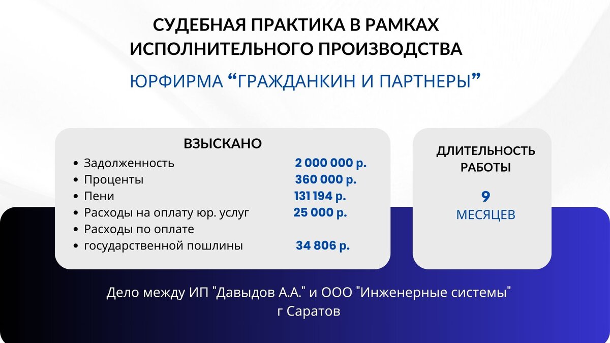 В Арбитражный суд обратился с исковым заявлением Индивидуальный предприниматель Давыдов Андрей Александрович к Обществу с ограниченной ответственностью «Инженерные системы». Целью иска было взыскание задолженности по договору денежного займа, процентов за пользование денежными средствами, а также пени и расходов на оплату юридических услуг и государственной пошлины. Общая сумма задолженности составляла 2 421 0000 рублей. Иск был удовлетворен, но не в полном объеме. Далее исполнительные производства были направлены на исполнение в отдел судебных приставов в декабре 2021 года. В апреле 2022 года ИП Давыдов А.А. обратился в нашу компанию для получения профессиональной поддержки. Ход оказания услуг: В декабре 2022 года задолженность по обоим исполнительным производствам была взыскана в полном объеме. По итогу сумма взыскания составила 2 551 000 рублей Следует отметить, что без участия юридической компании "Гражданкин и Партнёры" решение по исполнительному производству не было достигнуто. Э
