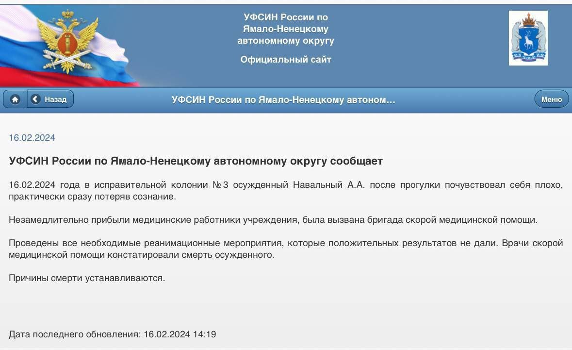 16.02.2024 года. в ИК №3 осужденный Навальный А. А. на прогулке почувствовал себя плохи, медики не смогли ему помочь и он скончался, по предварительным данным, оторвался тромб. Комментарий Кремя. Песков: ФСИН занимается всеми проверками. Мировые СМИ прерывают эфиры для сообщения данной новости. Ну что я могу сказать, не знаю какой он был человек, лично с ним не знаком, как блогер, да он достиг успеха, но не повезло, не фартануло. земля ему пухом.