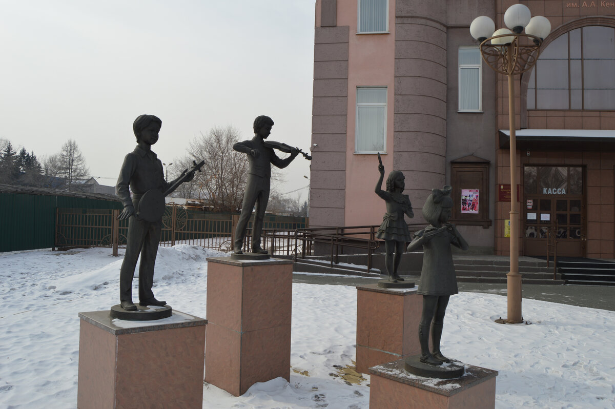 Продолжаем цикл историй об абаканских памятниках и скульптурах. Как выяснилось, одни установили в честь героев или важных исторических событий как символы памяти. Другие — как напоминание о важных качествах человека, например о любви, верности и доброте. А третьи отлично справляются с ролью шутников и весельчаков. Именно о них — сегодняшний рассказ. Четыре ноты аккорда Так вышло, что все памятники, о которых пойдет речь, были по очереди открыты в 2013 году. Итак, 31 мая, накануне празднования Международного дня защиты детей, на площади возле нового концертного зала Музыкальной школы им. А.А. Кенеля поставили скульптурную группу «Музыка и дети», которая состоит из фигур в натуральную величину. Два мальчика и две девочки держат в руках музыкальные инструменты: хомыс, скрипку, флейту и бубен. Сами фигуры были отлиты из бронзы и установлены на постаментах из керамогранита. Скульптором композиции стал красноярец Андрей Мурзин. Именно дети-музыканты, по задумке автора, символизируют будущее
