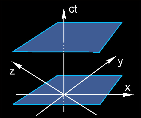 Руслан Шарипов. 1 2 3 ... en Понятие пространства-времени возникло в начале 20-го века в связи с теорией относительности Эйнштейна. Оно получилось соединением трехмерного пространства и одномерного времени, которые до этого рассматривались отдельно, в один четырехмерный континуум. Изобразить графически четырехмерный континуум мы не можем. Поэтому сократим трехмерное пространство до двумерного и зарезервируем третье измерение для изображения времени. Получится следующая картинка. Горизонтальные плоскости на рисунке символизируют собой состояния вселенной в различные моменты времени в ходе её эволюции. Фактически они трехмерны и их не две, а бесконечно много. Они заполняют собой все четырехмерное пространство-время. Вместо рассмотрения всей вселенной можно ограничиться какой-то её частью. Например земным шаром. Тогда получится следующая картинка. Вертикальная цилиндрическая структура, вытянутая вдоль оси времени, напоминает колбасу. Мне нравится называть её пространственно-временной колб