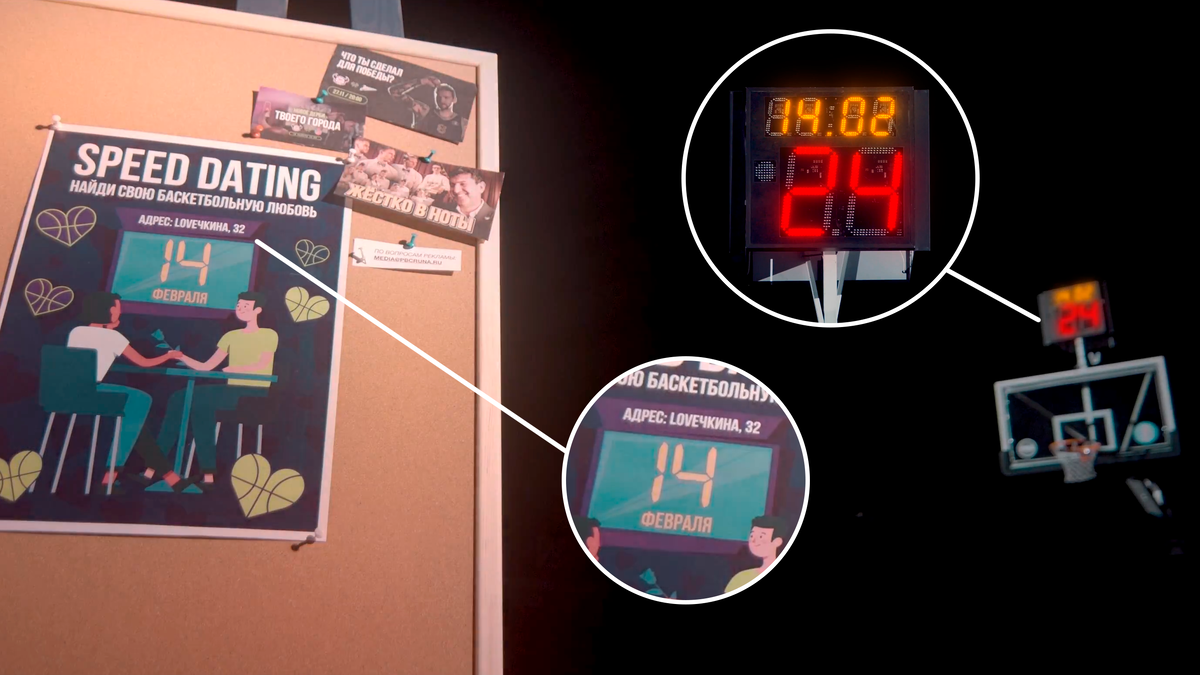 На первом кадре мы видим кольцо с включённым секундником. На нём можно разглядеть цифры 14.02 — дата события. И крупные 24 — время на атаку. Ровно столько мы даём нашим персонажам на знакомство — прямая отсылка к баскетбольным правилам. Включается свет, в кадре афиша мероприятия — «Speed Dating. Найди свою баскетбольную любовь». 14 февраля — это сам инфоповод и дата публикации ролика. Адрес: LOVEчкина, 32 — приправленный «любовью» адрес домашней арены нашего клуба.