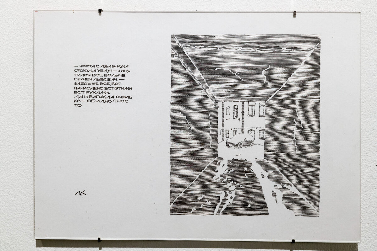 На открытии многие посетители, не знакомые с методом Крюкова, ошибочно принимали вручную расписанные линером листы за тиражные отпечатки, обработанные на компьютере, что совсем не удивительно. Созданные с педантичностью потомственного типографа работы фотографически точно выхватывают фрагменты хорошо знакомого и автору, и среднестатистическому жителю Москвы и Подмосковья пейзажа, будь то дома в Переделкино, окрестности станции Аминьевская, стандартное СНТ или анонимное болото, но могут отсылать и к вездесущему «где-то посреди нигде». Они дополняются текстом, выхваченным словно из современной русской прозы или из подслушанных разговоров никогда не видимых и всегда находящихся за кадром жителей этих мест, на самом же деле часто представляющим собой вольные размышления автора, накладываемые на пейзаж. Этот узнаваемый мир будто пропущен через лучи и перфорации, потому что в процессе излучения света мы ловим не все сигналы и отражаем их тоже с помехами. Эти помехи, белый шум, вносят хаос и деконструкцию в знакомые нарративы, из-за чего они воспринимаются иначе. По словам самого художника, получается такой проиллюстрированный условный Константин Георгиевич Паустовский, посылающий Ивану Сергеевичу Тургеневу или Петру Андреевичу Вяземскому слабые мерцающие сигналы, разбитые на линии, как будто их пропустили через шредер, а потом снова собрали в одно целое.
