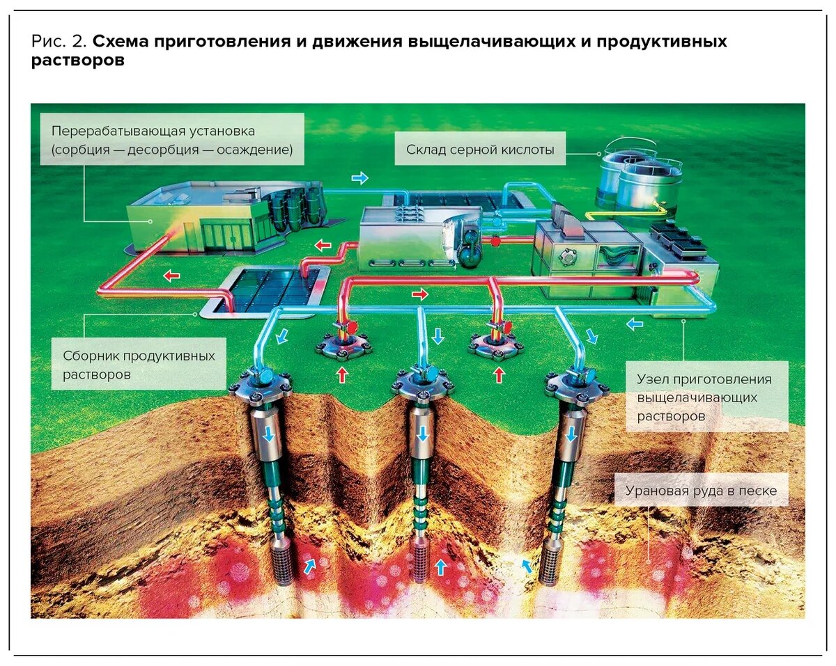 В горнодобывающей промышленности сложился парадокс: добывать уран из бедных руд с содержанием урана в доли процента методом СПВ выгоднее, чем открытым и подземным горными способами из богатых урановых руд — с содержанием урана 1–10% (есть и пример добычи урана подземным горным способом в Канаде на месторождениях с уникально богатыми рудами с содержанием 10–20%). На наших месторождениях содержание урана в породе составляет сотые доли процента, но добыча методом СПВ экономически более выгодна. При горном способе вскрышные работы, разработка карьера, проходка и эксплуатация горных выработок обходятся дорого. При использовании методов подземного выщелачивания мы хоть и тратим средства на сооружение скважин и временные наземные коммуникации, но зато избегаем капитальных затрат добычи горным способом. При бескерновом бурении технологических скважин мы обходимся практически без извлечения пустых и рудоносных пород. На наших предприятиях с применением метода СПВ не образуются отвалы пустых пород и забалансовых урановых руд, отходы гидрометаллургического производства, хвостохранилища. Фактически часть гидрометаллургического процесса переработки урановых руд — выщелачивание разбавленными растворами серной кислоты — осуществляется в недрах на месте залегания урановых руд. Руда не извлекается на поверхность, персонал рудника не контактирует с радиоактивными рудами. При горном способе добычи руду нужно извлечь из горной выработки на поверхность, раздробить и измельчить и затем переработать на гидрометаллургическом заводе. При СПВ на поверхность выкачивается только продуктивный раствор, из которого нужный нам продукт концентрируется (это не сложно) и направляется на дальнейшие переделы в ядерно-топливном цикле.