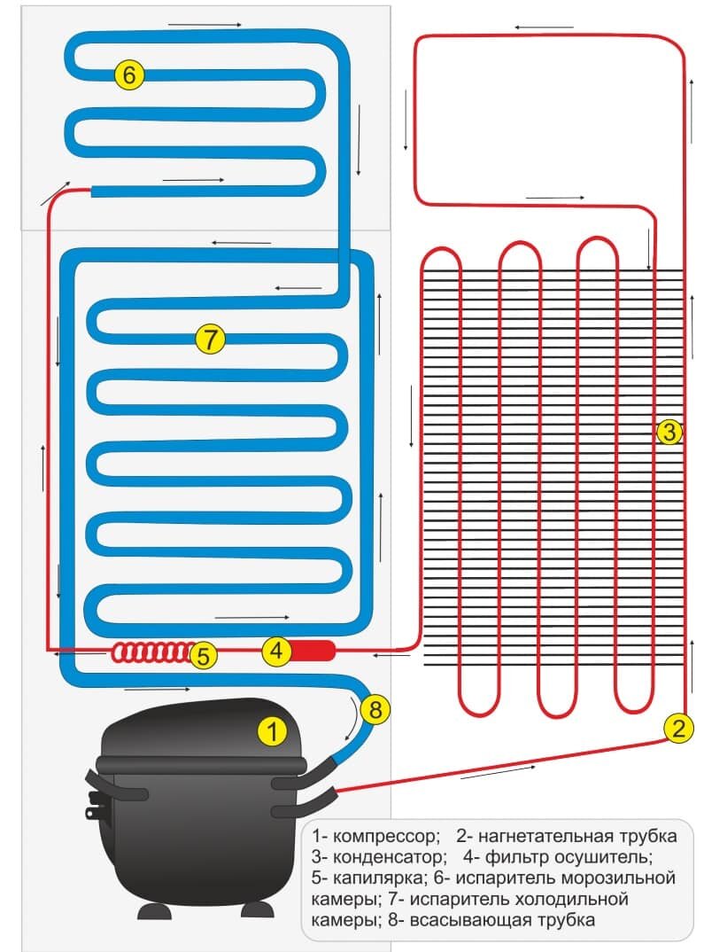 Холодильный агрегат работает следующим образом. Мотор-компрессор откачивает пары фреона из испарителя и нагнетает их в конденсатор. В конденсаторе пары фреона охлаждаются и конденсируются. Далее жидкий фреон через фильтр-осушитель и капиллярный трубопровод попадает в испаритель. Гидравлическое сопротивление капиллярного трубопровода подбирается таким образом, чтобы создать определенную разность давления всасывания и конденсации, которое создает компрессор, при которой через трубопровод проходило определенное количество жидкости. Каждый капилляр соответствует определенному мотор-компрессору. На входе фреона в испаритель, давление падает от давления конденсации до давления кипения. Этот процесс называется дросселированием. При этом происходит вскипание фреона, поступая в каналы испарителя фреон кипит, энергия необходимая для кипения в виде тепловой, забирается от поверхности испарителя, охлаждая воздух в холодильнике. Пройдя через испаритель жидкий фреон превращается в пар, который отка