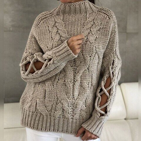 Рекомендуемая пряжа — толстая полушерсть, желательно гладкой скрутки, чтобы не распушалась. Средний метраж — 100-150 м на 100 гр. Например, отлично подойдёт Yarnart Merino Bulky: 30% шерсть, 70% акрил; 100 гр — 100 м. Основной узор для переда (на рукавах идут только жгуты и о них напишу ниже отдельно) — не бойтесь большой схемы, тут всё стандартно и просто. А вот с вязанием рукавов маленькая хитрость. Лично я вижу такой способ: вяжем рукава поворотными рядами от пройм, но шов при этом помещаем не в зону подмышек, а по плечевым швам (то есть начало и конец вверху, а не внизу) — «сшивать» рукав мы будем той самой декоративной шнуровкой. В начале рукава и в конце рукава вяжем одиночные жгуты 2х2 (можно и 3х3, зависит от выбранной пряжи и её толщины): после первого жгута, который у нас будет идти в начале ряда, добавляем 2 изнаночные петли и ещё 2 изнаночные добавляем перед вторым жгутом в конце вязания рукава. Между изнаночными петлями будет лицевая гладь. Для вязания манжет можно п