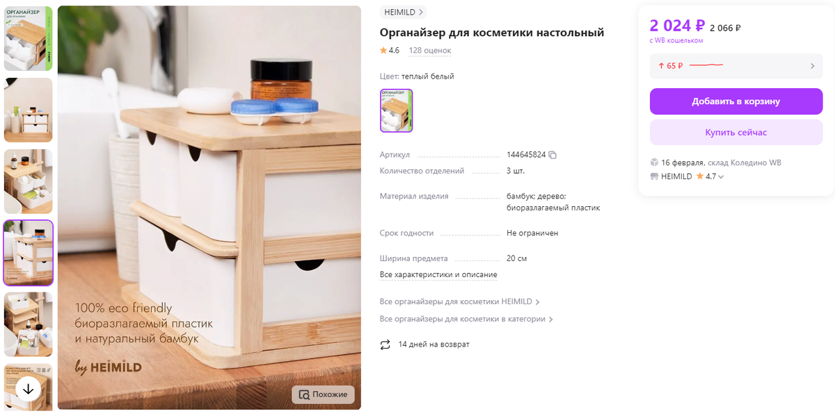 В этой статье мы представим вам 6 удивительных находок, которые помогут создать атмосферу уюта и практичности в вашем доме. Благодаря широкому ассортименту товаров на Wildberries вы сможете обновить интерьер, сделать вашу кухню функциональной, ванную комнату стильной и спальню уютной. 1.Органайзер для косметики настольный Органайзер для косметики BORG от HEIMILD - это стильный и экологически чистый товар, изготовленный из натурального бамбука. Он имеет эргономичный дизайн и идеально вписывается в современный интерьер. Органайзер обладает тремя вместительными контейнерами из биоразлагаемого пластика, что позволяет хранить и организовывать различные косметические аксессуары и принадлежности. Он также помогает сэкономить место и может использоваться в ванной комнате, на туалетном столике или на рабочем столе. Пользовательская оценка: 4.6 из 5