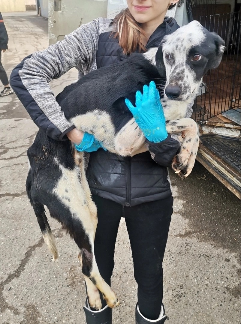 Черно-белый пес Бакс, приехал по программе ОСВВ, на задние лапы не вставал, понос и рвота не прекращались обессилен и обезвожен, температура высокая. В тяжелом состоянии отвезли Бакса в одну клинику, после нескольких дней лечения пришлось перевезти умирающую собаку в другую клинику. Первоначальный диагноз вирусное заболевание, после доп. обследования запущенный пироплазмоз. В теле собаки пули, одна пуля задела позвоночник,из-за этого пес не вставал на лапы. Лечение пироплазмозома достаточно успешно пролечили, Бакс начал сам есть. А с позвоночником ситуация сложнее, но Бакс начал ходить сам.