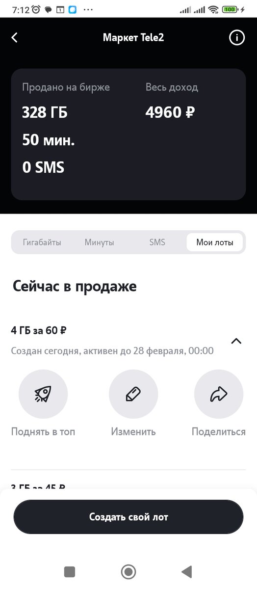 Привет, друзья! Я не раз писала о том, что иногда продаю излишки интернета на Теое2, те, которые знаю, что мне точно не пригодятся. Вот и вчера я попала "в струю", один за одним у меня купили несколько лотов по 4 ГБ интернета. Вот история продаж. Сначала я подняла в топ продаж упавший лот, его тут же купили, потом создавала ещё лот за лотом и из тоже расхввтали, как горячие пирожки. Не каждый раз такие хорошие продажи идут у меня, но иногда случаются. Если я попадаю на такой"клёв", то за 10 минут могу продать месячный запас интернета, который мне не потребуется. Такие случаи у меня бывали уже не раз. Ну а пока я продала не нужного мне интернета почти на 5000, вернее пока на 4960 рублей. И это не предел. Этими деньгами я оплачивают связь Теле2. А у вас как с аналогичными продажами? Есть они или впервые слышите про такое? Ваша @leila