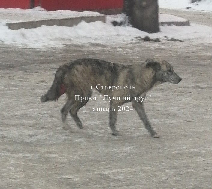 В небольшом городе долгое время бегала тигровая собака с выпавшей маткой. Ее пытались ловить местные волонтеры, но собака суперосторожная и в руки не давалась. Состояние собаки ухудшалось, медлить уже было нельзя, поэтому пришлось ее наркозить на расстоянии и везти в клинику.
