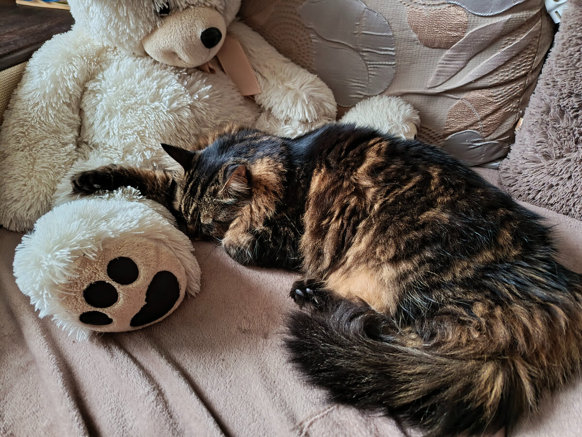 Расскажу как я классно отдохнул, хорошо провел время с хозяином, немного пожалуюсь на хозяйку. Всем привет! Вчера хозяин вроде и выходной был, а куда-то уехал. И так классно было, он не занимал мое местечко на диване и я вот так вот спал с мишкой: Линяю я жутко, в этом месте весь плед в шерсти. Поспал, потом пришел хозяйке помурчал, она была немного удивлена. Обычно я прихожу к хозяину погладиться, помурчать. С утра дождь шел, не нравится мне что нельзя нормально на балконе посидеть. Когда окно закрыто - не интересно, а, если открыть - брызгает и мокро. Вечером хозяйка пришла на кровати полежать, а я в виде шапки спал: Она меня потревожила и я вот так сделал: А потом вообще меня хозяйка взяла и переложила, хоть я и недоволен был. Еще и радовалась, что я ей местечко нагрел. Разбудили и уже сон не тот. Пошел рядом с хозяином сидеть. Тот долго не обращал на меня внимание, а потом взял меня на ручки. Хорошо мы с ним посидели. Понравилось мне. Я ещё немного покусался, лапкой ему по лиц