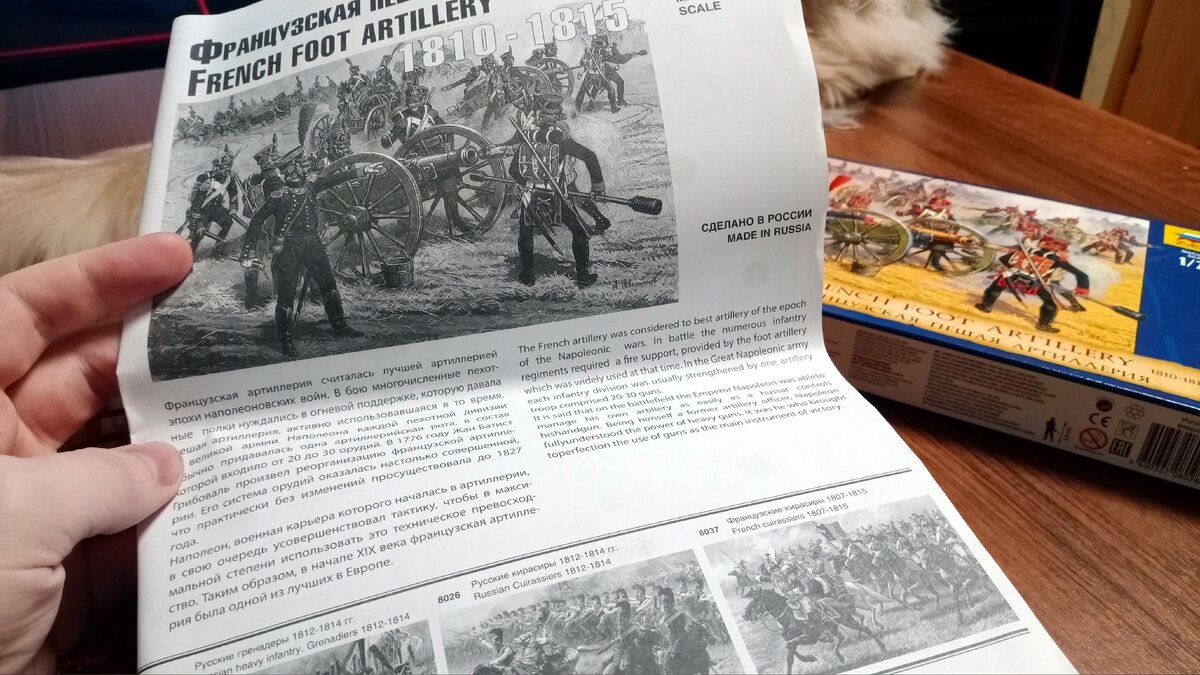 Прямо скажем, красный цвет для «звездовских» миниатюр (и даже конкретно для «наполеоники») не нов — гвардейские казаки, например, выполнены из пластика как раз красного цвета. Тем не менее, такой контраст всё равно коробит, ибо как-то уже привык, что французы имеют синий (и оттенки) цвет, а русские — зелёный (с оттенками, безусловно). Но да ладно! Для тех, кто миньки красит, это вообще не принципиально. Итак, артиллерия, поехали :-) Немного копипастной исторической справки Если не ошибаюсь, в данном наборе пока самый большой разброс дат: сам набор начали лить аж в 2006, если верить литнику, а конкретно моя коробка была изготовлена в феврале 2021. Инструкция тут тоже внушает, ибо целых четыре страницы. Копипаста: «В 1776 году Жан Батист Грибоваль произвел реорганизацию французской артиллерии. Его система орудий оказалась настолько совершенной, что практически без изменений просуществовала до 1827 года. Наполеон, военная карьера которого началась в артиллерии, в свою очередь усовершенств