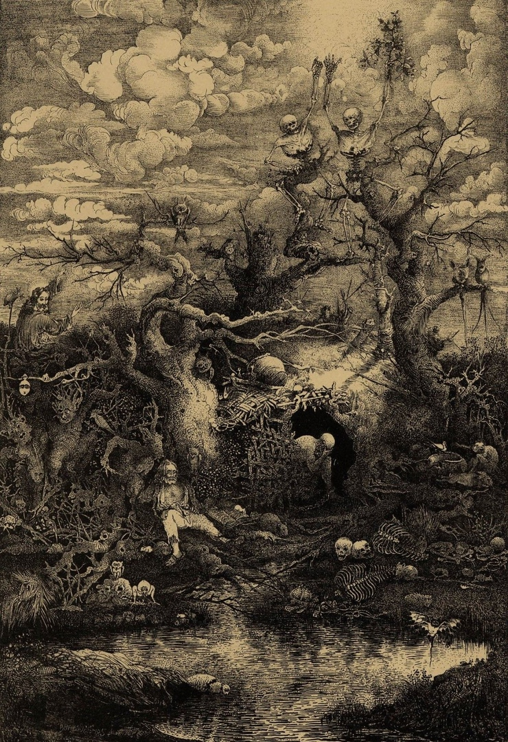 Родольф Бресдин (Rodolphe Bresdin; 12 августа 1822, Ле Френ-сюр-Луар - 11 января 1885, Севра) - французский художник и гравер. Его фантастические картины, полные странных деталей, особенно привлекали Шарля Бодлера, Виктора Гюго, Теофиля Готье, Жориса-Карла Гюисманса, Роберта де Монтескью, Андре Бретона. Символист Одилон Редон был его учеником. Бресдин оказал влияние на таких современных художников, как Жак Моро, Жорж Рубель, Жан-Пьер Велли и Филипп Молиц. История жизни Бресдина и его искусство одновременно необычны и увлекательны. Он был одним из лучших и самых оригинальных художников 19 века, и его имя стоит в одном ряду с именами Уистлера, Доре и Мериона. В какой-то степени он был порождением бретонской сельской местности с ее бардскими фольклорными традициями, позже полюбившейся Гогену и его окружению, а отчасти и Анри Мюрже. В картинах Бресдина присутствует колорит Блейка и ощущается некоторое влияние Дюрера. Его изображения природы, демонстрирующие ее удивительное очарование наряд