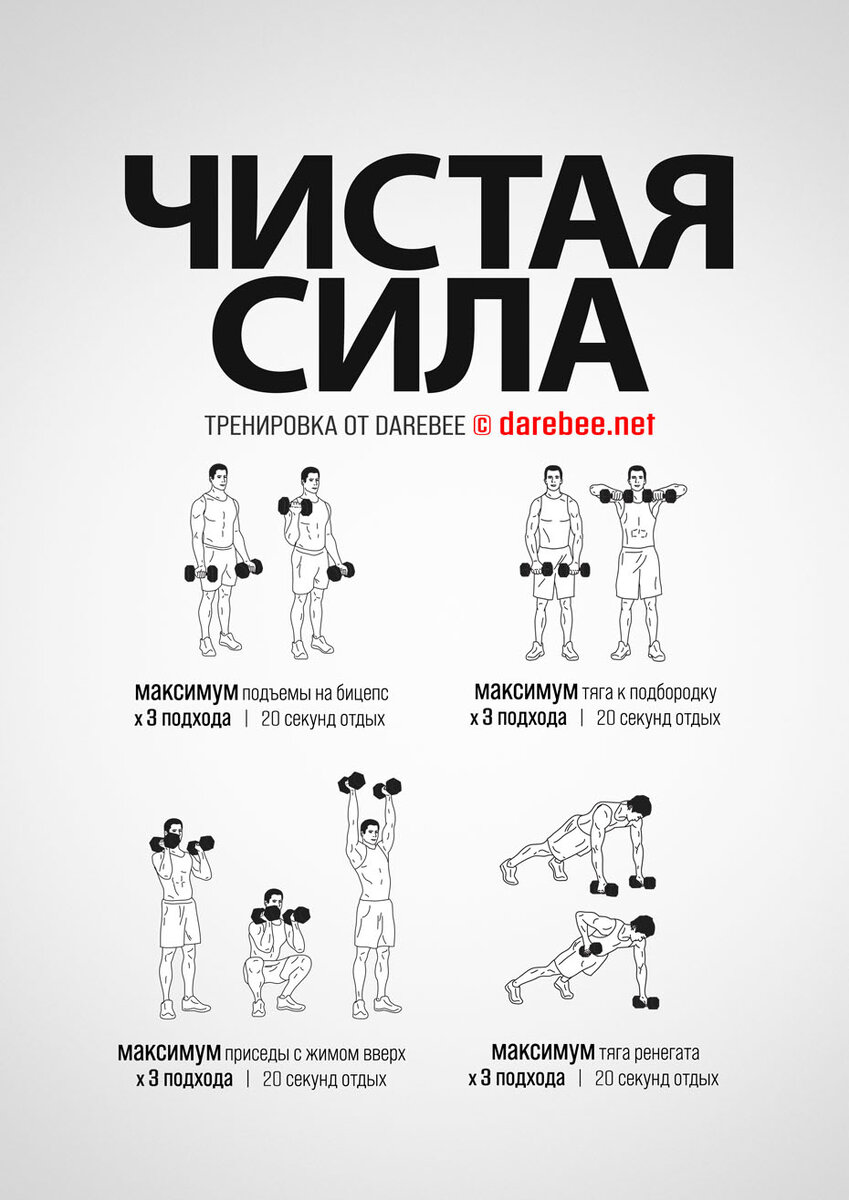 Новый релиз — Чистая Сила. Это силовая тренировка с гантелями от Darebee. https://darebee.net/pure-power-workout.html ЦЕЛЬ: все тело ТИП: сила СЛОЖНОСТЬ: 3 — подходит для начинающих