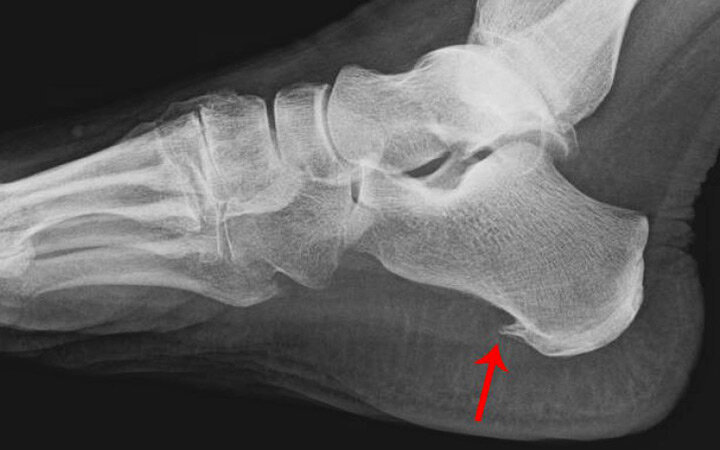 - ахиллова (задняя): остеофит разрастается на задней поверхности пяточной кости в месте крепления ахиллова сухожилия (редкая форма).