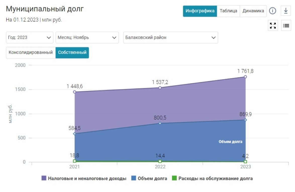 Муниципальный долг Балаковского района продолжает стремительный рост. Обновленные данные на 1 декабря 2023 года публикует интернет-проект Министерства финансов Саратовской области "Открытый бюджет". По данным профильного министерства собственный долг Балаковского района достиг 869,9 миллиона рублей. Месяцем ранее он составлял 804,9 миллиона. Таким образом, всего за месяц Администрация Сергея Грачева увеличило долговую нагрузку ровно на 65 миллионов рублей. При этом, на указанную дату налоговые и неналоговые доходы бюджета Балаковского района составили 1761,8 миллиона рублей.