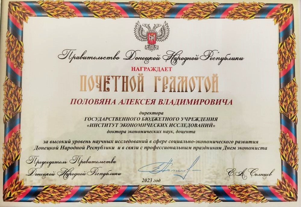 Заведующий кафедрой менеджмента ДонГУ Алексей Половян награжден Почетной грамотой Правительства Донецкой Народной Республики за высокий уровень научных исследований в сфере социально-экономического развития Донецкой Народной Республики и в связи с профессиональным праздником Днем экономиста. Почетная грамота подписана Председателем Правительства Донецкой Народной Республики Евгением Солнцевым.