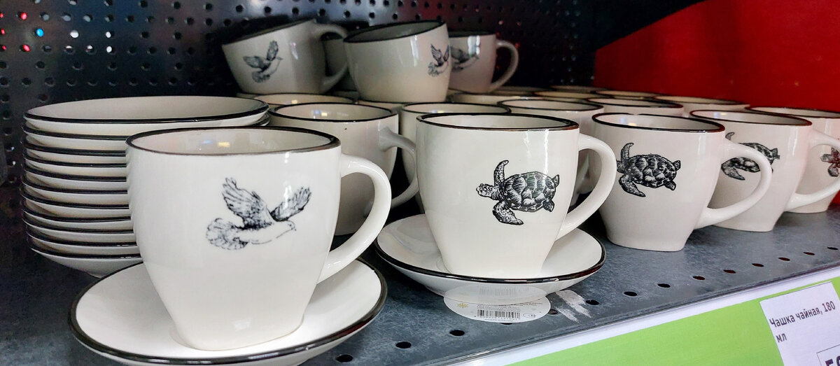 Появилась в продаже чашка чайная, такие уже были в продаже, теперь с новым стильным рисунком: черепашка, голубь. Объем 180 мл. Изготовлена из фаянса. Цена 59 рублей.