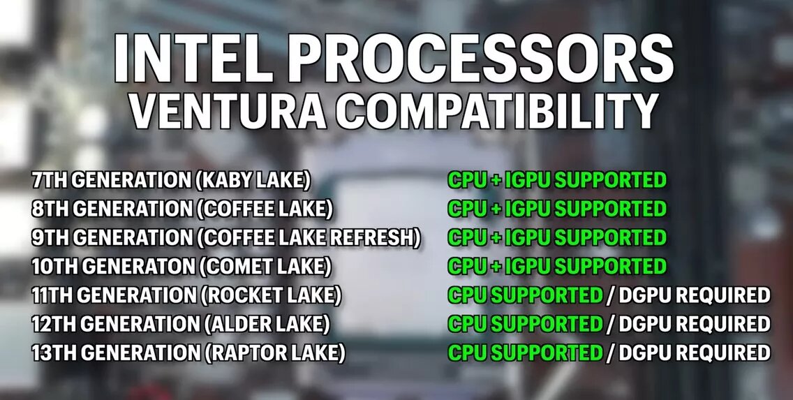 Итак, остается Intel. С выходом Ventura Apple прекратила поддержку Mac старше 2017 года. Это означает, что больше нет поддержки встроенной графики в проц