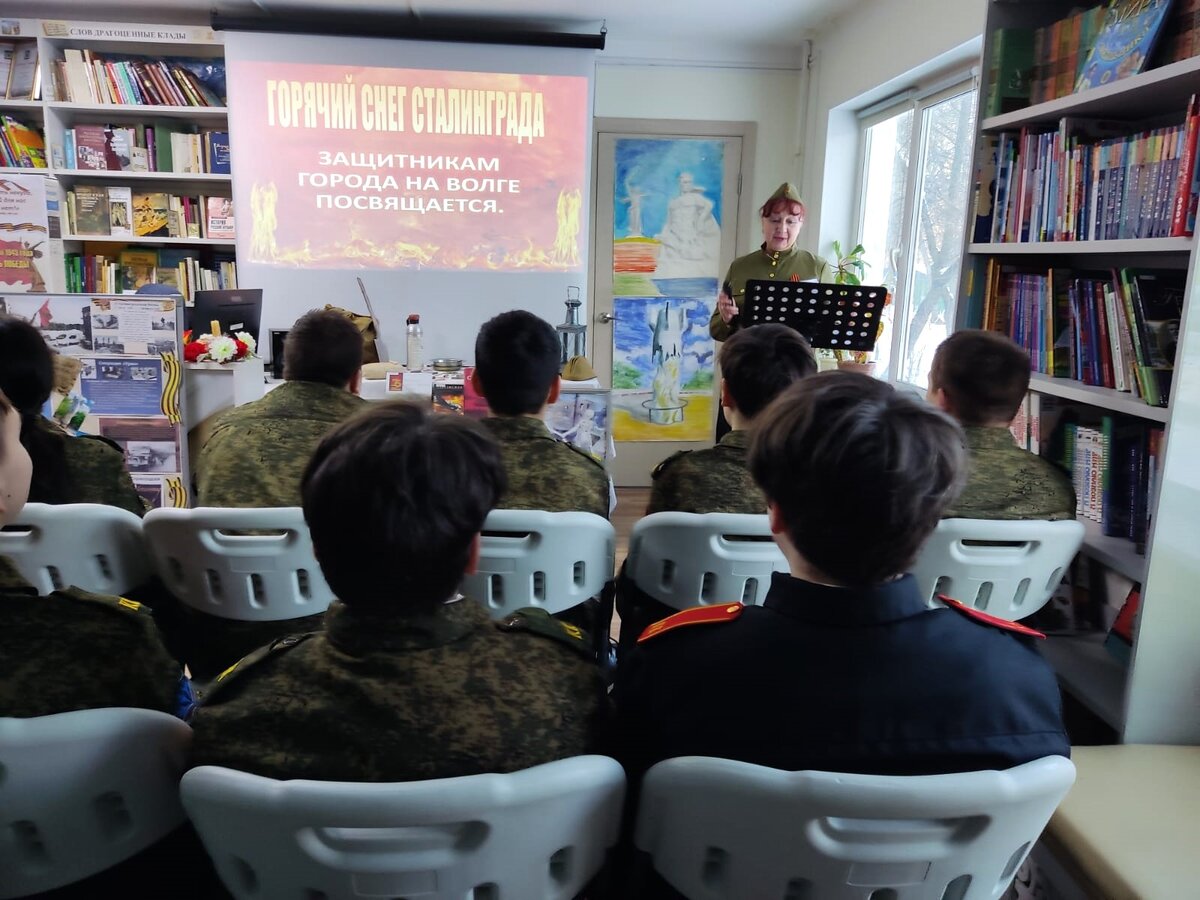 Открытые степному ветру, Дома разбитые стоят. На 62 километра В длину раскинут Сталинград. Как будто он по Волге синей В цепь развернулся, принял бой, Встал фронтом поперёк России – И всю её прикрыл собой! Сергей Орлов 2 февраля 2024 года – День воинской славы России. Страна отмечает 81-ю годовщину Сталинградской битвы – одного из самых кровопролитных и решающих сражений Великой Отечественной войны. В течение 200 дней Красная Армия сражалась с немецкими войсками в ожесточенных боях за каждый дом, каждую улицу, каждый метр земли. «За Волгой для нас земли нет» — говорили ее защитники. Битва имела огромное значение для нашей страны, она стала переломным моментом не только в Великой Отечественной, но и Второй мировой войне. Библиотека семейного чтения ежегодно отмечает важные исторические даты – Дни воинской славы. 2 февраля в читальном зале библиотеки прошёл патриотический час для ребят из 7 кадетского класса школы № 2117, посвящённый Сталинградской битве. Ведущая Комарова Анжелика