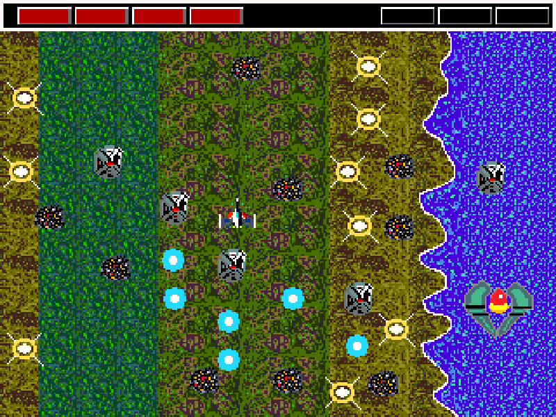 Пиксель арт на сегодня по мотивам видеоигры Thunder Force 2 для игровой приставки Sega Megadrive. Довольно отличная стрелялка про самолетик. Такой целый жанр игр в 90ые был. И это было очень увлекательно. А это мой рисунок на подобную тему. Инопланетное вторжение началось. Уже целый месяц интенсивных столкновений с инопланетянами. Они летают на чем-то типа летающих тарелок. Это раз. Удалось собрать целую серию экспериментальных самолетов. Это два. И три – это, то что ты летаешь на одном из таких. Известно, что инопланетное используют телепорты. Уничтожай их. И так удастся остановить вторжение инопланетян. Инопланетяне прилетели из телепортов. И устанавливают свой контроль. Но они только летают. Они не плавают и не двигаются по земле. Это летающие тарелки, которые летают над территорией или стоят на месте. По меркам Земли, необычный подход. И также они устанавливают свои защитные укрепления, башни на поверхности. Это единственное, что их связывает с поверхностью. В основном их летающие