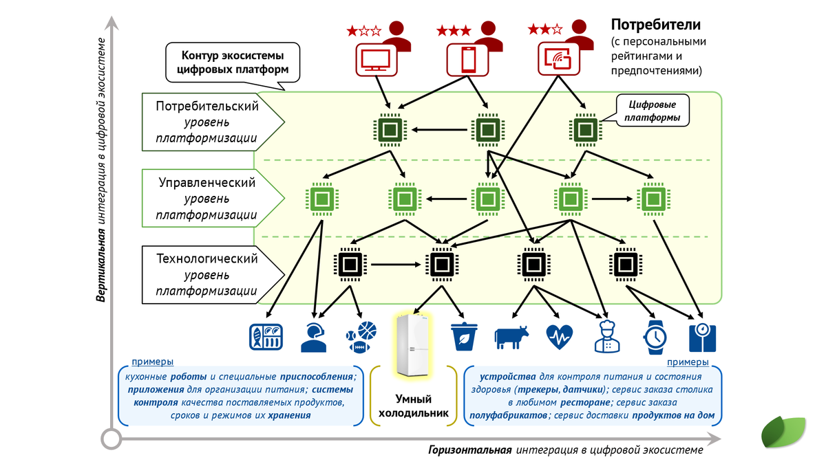 Анализируя, пусть даже в первом приближении перспективы развития цифровой экосистемы решающей задачи клиентов по персонализированному управлению своим питанием, обнаруживается задача интеграции множества сопутствующих разноплановых устройств (интернет вещей) и совместной реализации множества функций и пользовательских сценариев (экосистема платформенных решений). Например, вместе с умным холодильником вполне способны совместно работать в интересах клиента: