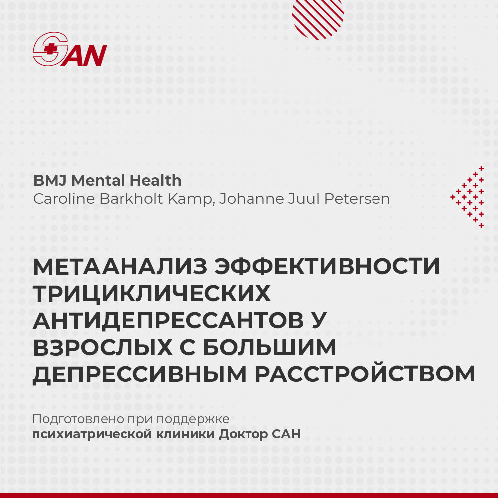 В систематическом обзоре и метаанализе оценивались полезные и вредные эффекты всех трициклических антидепрессантов у взрослых с большим депрессивным расстройством. Полученные данные свидетельствуют о том, что долгосрочные эффекты трициклических антидепрессантов и влияние их на качество жизни по-прежнему неизвестны. Краткосрочные результаты позволяют предположить, что трициклические антидепрессанты могут уменьшать симптомы депрессии, одновременно увеличивая риск серьезных побочных эффектов, но эти результаты были основаны на доказательствах низкой и очень низкой достоверности.