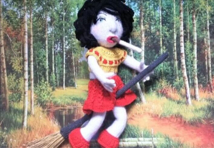 Одной из любимых героинь фильмов-экранизаций русских сказок у внучки была Баба Яга. Вообще, отрицательные персонажи вызывали в ней больший интерес, наверное потому, что они были живее, фактурнее лубочных положительных героев. Особенно Ксюше нравилась Баба Яга из сказки "Морозко" в исполнении незабвенного Георгия Милляра. Внучка садилась в какую-нибудь картонную коробку, брала в руки щётку для уборки (метлы-то в квартире не было) и ,отталкиваясь ею, скользила по полу, воображая себя летящий в ступе по небу Бабой Ягой . Естественно, что второй из сказочных героинь была связана Баба Яга, вернее, её правнучка в современном облике. Вместо трубки, как у милляровской Яги, во рту у неё сигарета (как связать трубку не придумала). Особо страшной Яга не выглядит, но какая-то стервозность в ней просматривается. Кукла цельновязанная, бесшовная, ростом 40 см.