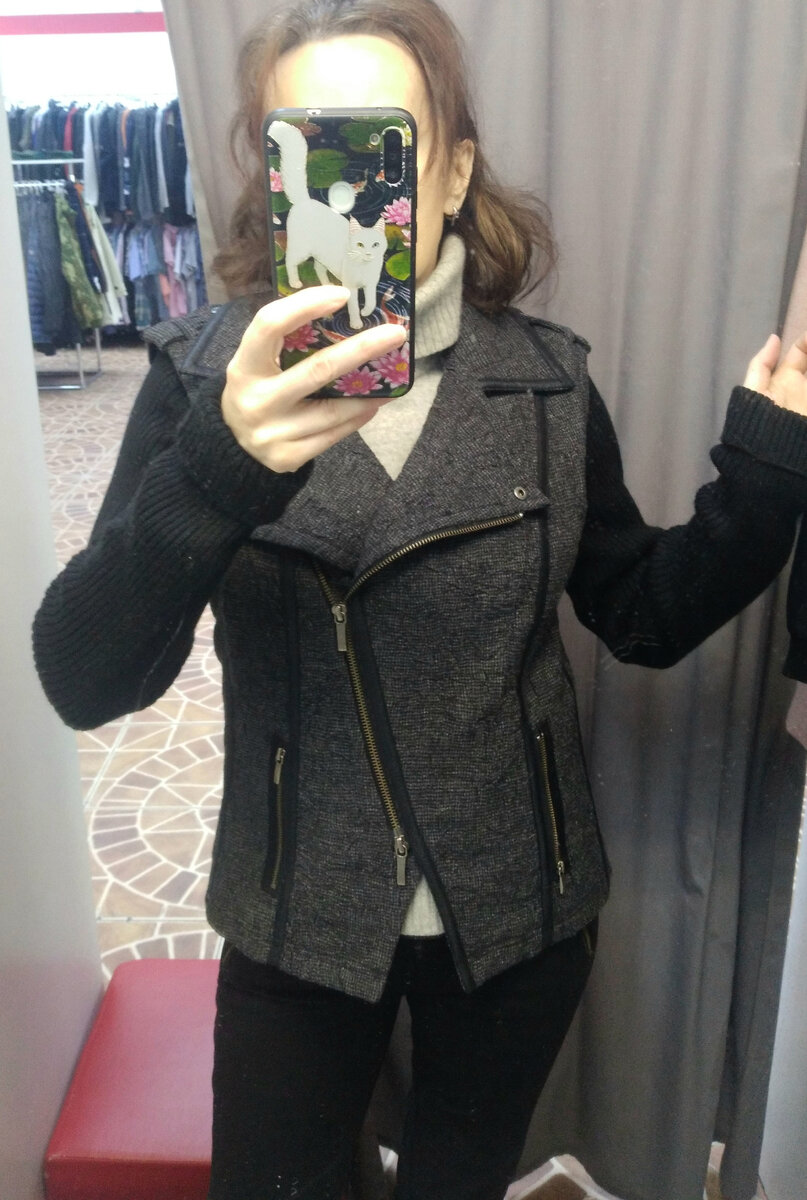 Здравствуйте, все таки весна на носу, сегодня ночью проснулась от разборок уличных котов. Бедный Тихон почти прилип к оконного стеклу, так ему надо была узнать, что происходит. А может дикие коты собрались на штурм дома? Наш пушист очень большой ревнивец и собственник, он года два боролся с Еремой за титул " самого обожаемого и любимейшего котика, владельца обширного поместья с мисками, лотками и лоджией с видом на рассвет")). Не знаю как долго шли разборки, но начало весне уже положено, весне быть!!)) Все можно было купить со скидкой 60%, цены пишу полные. Лёгкая серая куртка с чёрными трикотажными рукавами. Вроде бы мне и нравится, но талия не на месте((. Немного приталенная курточка, с прямой моделью было бы лучше. Двубортное пальто с маленьким воротником. Ткань в тонкую диагональную полоску, издалека это сложно понять. Нравится как на мне сидит пальто, оно такое аккуратненькое, плечи по размеру. Ну конечно, целых 10% шерсти заслуживают цену под 4тыс.((. Лёгкий бомбер на подкладке.