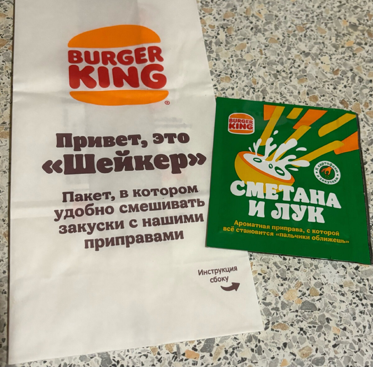 Всем привет! Постоянные подписчики моего канала знают что я люблю пробовать все новое, необычное и вкусное. В выходные мне не хотелось готовить ужин и поэтому решила заказать что то из доставки, выбор пал на Burger King. В меню появились новинки, ну и конечно же их и решили попробовать. У картошки в меню появилась новинка под названием сметана и лук - это стандартная картошка фри или по деревенски со специями со вкусом сметаны и лука. Мне нравится такое сочетание специй у чипсов, поэтому решила и тут попробовать, но мое внимание больше привлекла не картошка, а то что эти специи можно приобрести отдельно, а потом уже добавить куда то по своему усмотрению. Стоят немного - 19,99 рублей, за пятиграммовый пакетик со специями и продают его в комплекте с бумажным пакетом (у них он называется шейкер) куда можно засыпать снеки, специи и все в нем перемешать. На пакетике со специями написано, что приправа ароматная, что действительно правда, по вкусу тоже приятные. По моему мнению их можно испол