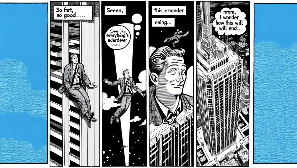 Пролетает мимо 25-го этажа, бормочет: “Вроде всё под контролем”.