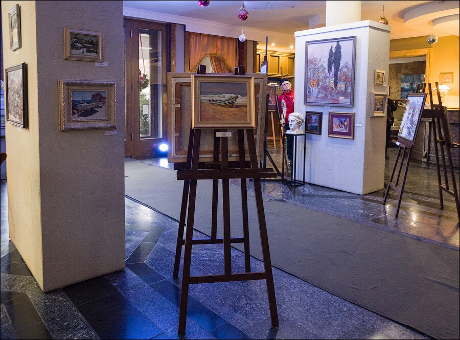 Потом мы поехали в арт-отель «Украина». В его холле нас ждала следующая вкусность: выставка свежих картин крымских художников. Игорь Шипилин, Николай Дудченко, Александр Шадура, Даниил Волков, Александр Тюнькин…