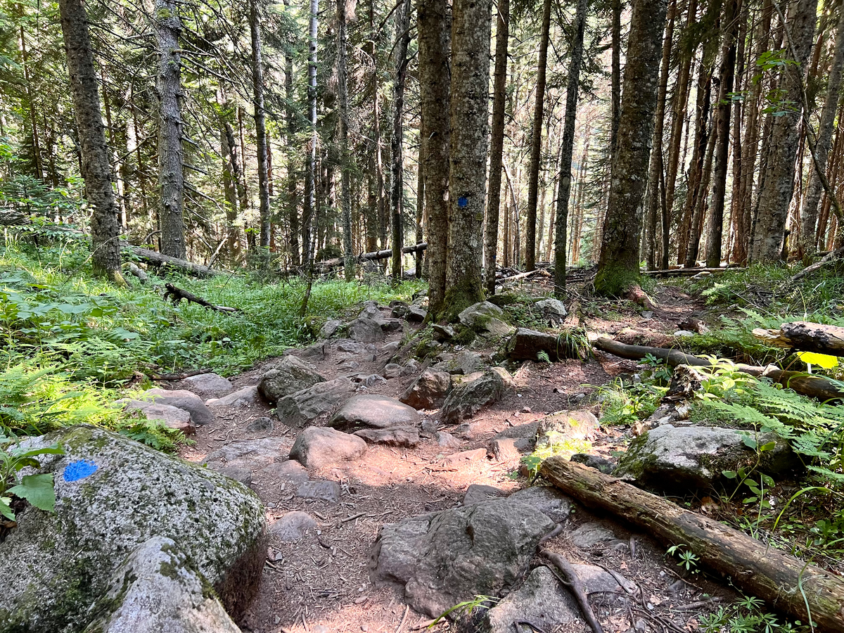 Долгий подъём заканчивается, лес расступается и перед нами открывается огромная поляна из глыб и камней - курумник. Путь по нему, пожалуй, наиболее сложный. Нужно всё время смотреть под ноги, чтобы не оступиться.