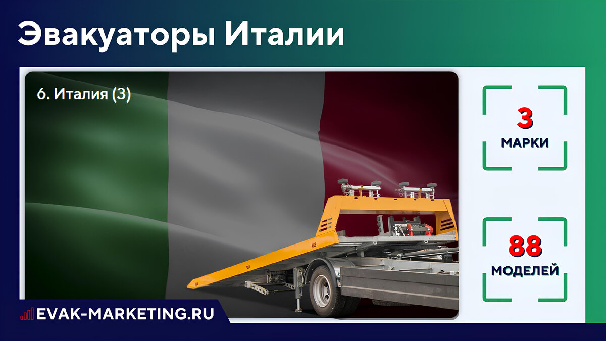 Создал подборку со списком марок эвакуаторов производства Италии. Всего набралось 3 марки и 88 моделей. Посмотреть всю подборку моделей вы можете перейдя по этой ссылке. Если вам нужны заказы на эвакуатор, трал, манипулятор, автовоз или на любой другой вид спецтехники или услуги, то вы можете заказать у меня создание сайта с настройкой контекстной рекламы в Яндекс.Директ для Поиска и РСЯ. Оставьте заявку на сайте или напишите мне в мессенджер Вацап или Телеграм. Более подробную информацию об услуге вы можете найти на главной странице сайта перейдя по ссылке.
