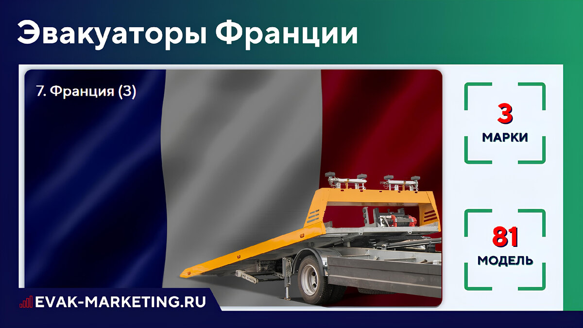 Создал подборку со списком марок эвакуаторов производства Франции. Всего набралось 3 марки и 81 модель. Посмотреть всю подборку моделей вы можете перейдя по этой ссылке. Если вам нужны заказы на эвакуатор, трал, манипулятор, автовоз или на любой другой вид спецтехники или услуги, то вы можете заказать у меня создание сайта с настройкой контекстной рекламы в Яндекс.Директ для Поиска и РСЯ. Оставьте заявку на сайте или напишите мне в мессенджер Вацап или Телеграм. Более подробную информацию об услуге вы можете найти на главной странице сайта перейдя по ссылке.