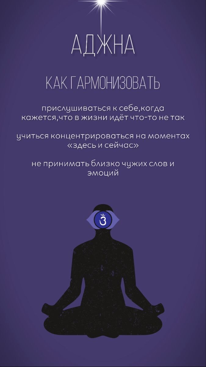 Чакра интуиции и интеллекта. Тот самый «третий глаз». Цвет - темно синий. Чакра расположена в районе гипофиза с проекцией на межбровье в лобовой части головы. Символизирует альтернативное зрение и способность воспринимать вибрации энергетического потоков, считывать информацию извене. Важнейшей функцией чакры является восприятие в любой форме его проявления. Получение любого рода информации, ее принятие и обработка происходит именно через Адену. Способность человека к приему того или иного потока информации определяется размером шестой энергетической воронки. Развитие и прокачка шестой чакры выводит человека на высочайший духовный уровень. АДЖНА - это путь энергии духовности. Отвечает за следующие сферы и аспекты в жизни человека: • разум • зрение • восприятие • память • подсознание • логику и интуицию • интеллект Аджна даёт способность принимать информацию, считывать происходящее вокруг, анализировать, делать выводы. Она позволяет «видеть» людей и вещи насквозь , осознавать их исти
