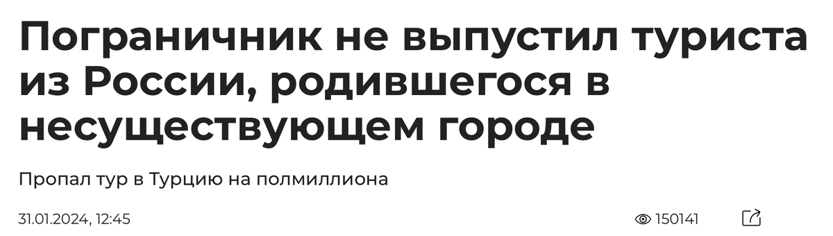 Туристку из екатеринбургского аэропорта Кольцово не пустили в Анталью, изъяли российский и загранпаспорт, а также оштрафовали. Действия местных пограничников объяснили тем, что в документах женщины в графе «место рождения» был указан Екатеринбург, а не Свердловск. Об этом пишут в закрытом Telegram-канале со ссылкой на слова некоего очевидца. Дело в том, что туристка родилась в 1980-х годах, тогда как Свердловск стал Екатеринбургом лишь в 90-е. Новость о туристке, у которой отобрали документы в Кольцово, — фейк. В пресс-службе Пограничного управления ФСБ России по Челябинской области, которое занимается проверкой паспортов в аэропорту, прокомментировали ситуацию. «Случаев, при которых в качестве оснований считать заграничный паспорт недействительным с последующим его изъятием по причине указания в реквизите «место рождения» Екатеринбург, когда фактически гражданин родился в Свердловске, в аэропорту Кольцово не установлено… Изъятие внутренних паспортов граждан России не осуществлялось»,